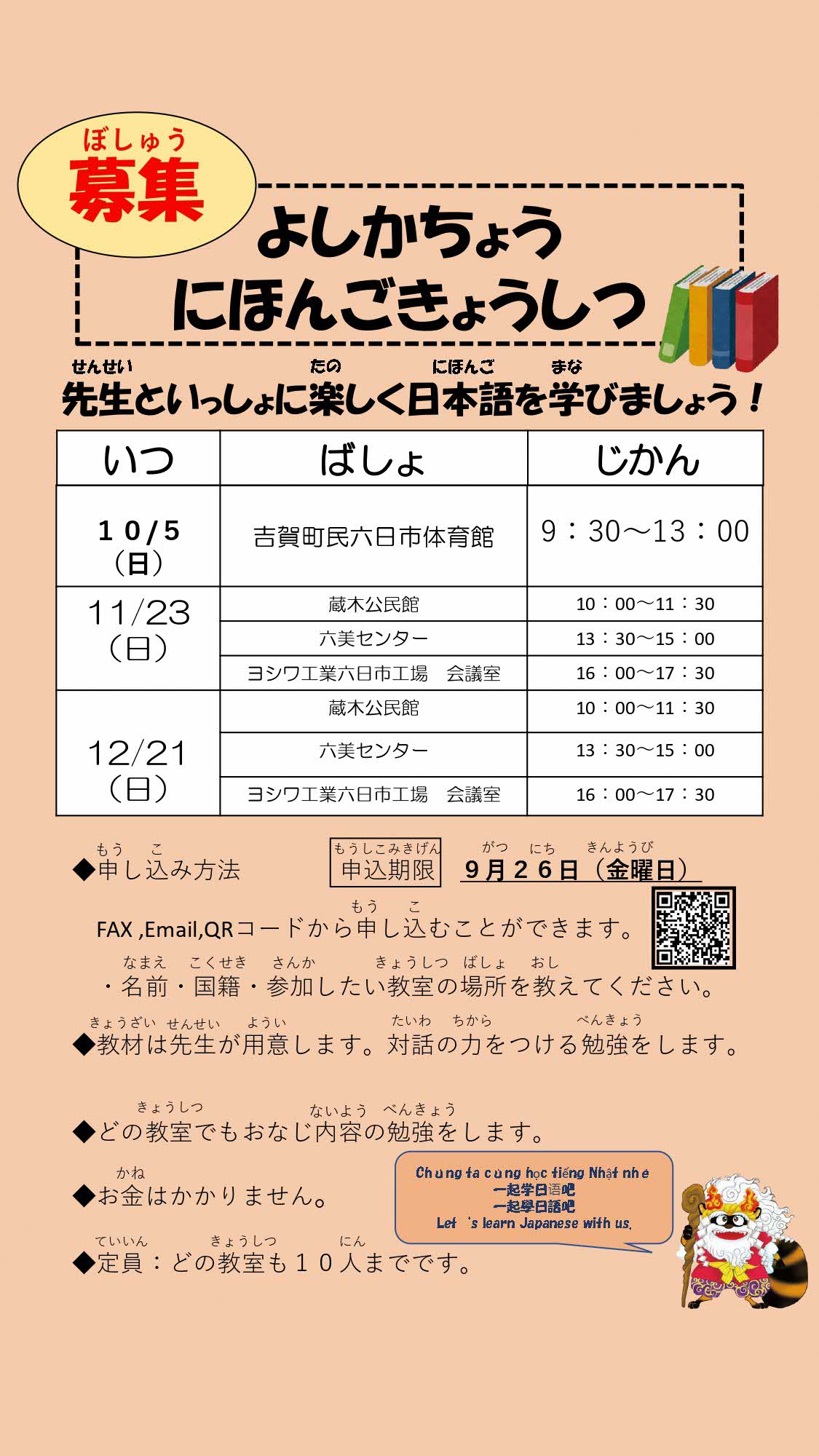 どの教室[きょうしつ]も10人[にん]まで